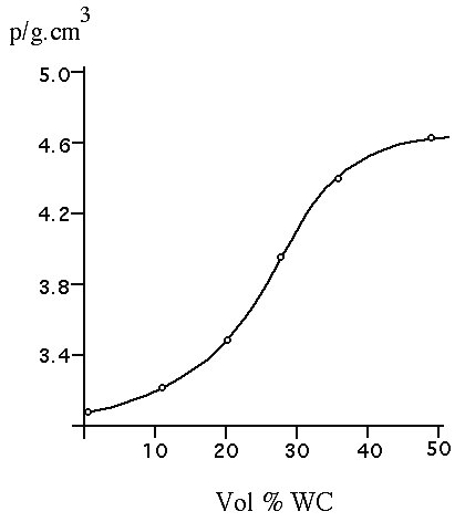 Density of a heterogenous mixture of aqueous sodium polytungstate solution and tungsten carbide as a function of the solid material volume portion starting from a saturated aqueous sodium polytungstate solution