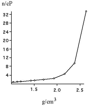 The viscosity of aqueous sodium polytungstate solution as a function of density portion at 77°F (25°C).